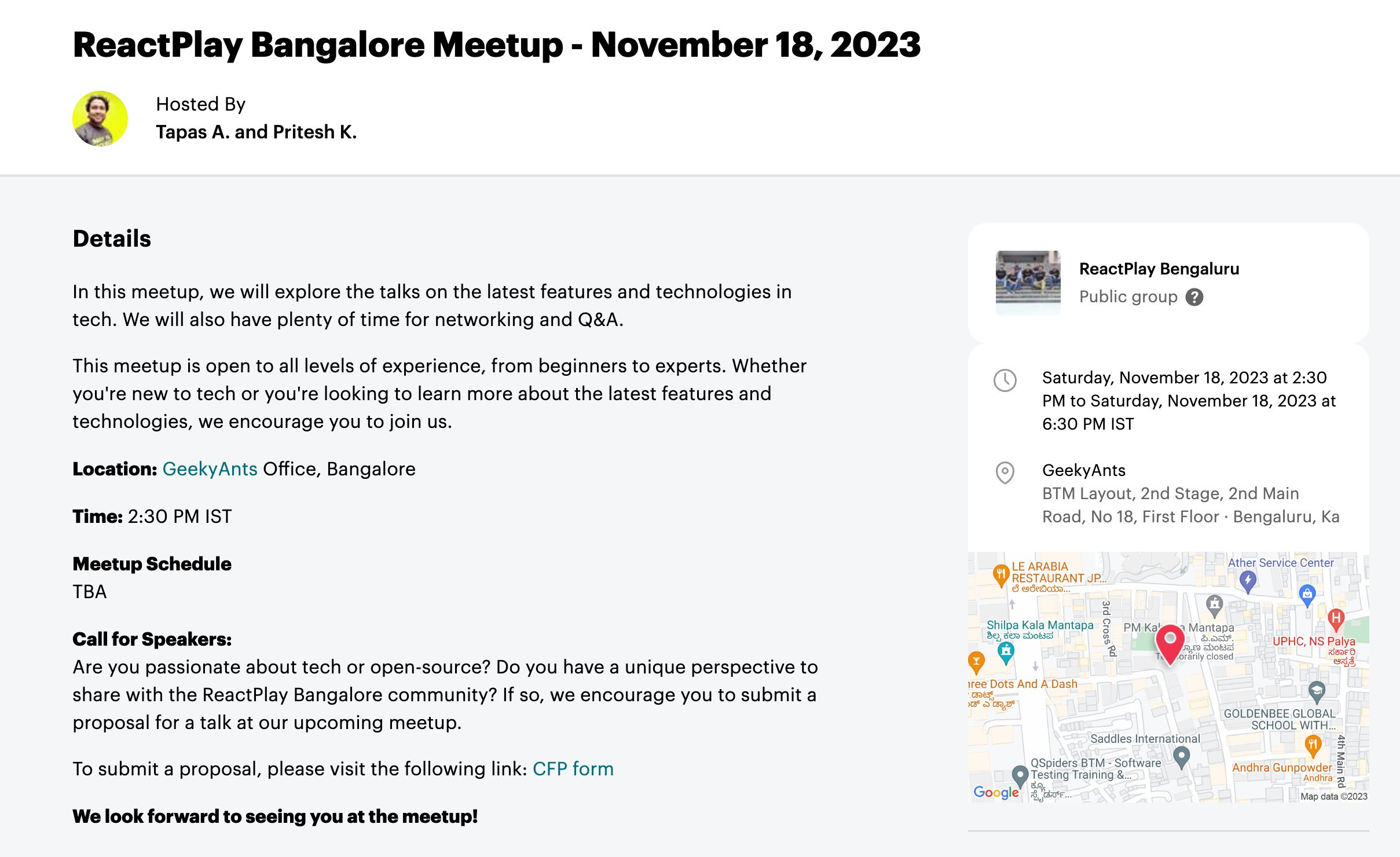 We are pleased, thrilled, and super excited to announce our first-ever in person meet up at Geekyants office in Bangalore on 18th November and the CFP is opened now.